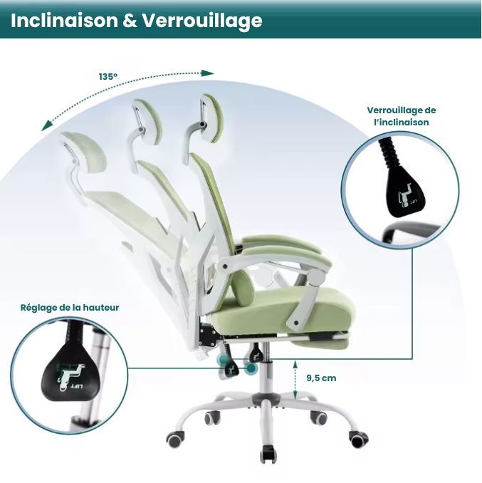 Son mécanisme d’inclinaison verrouillable (90° à 135°) permet d’alterner aisément entre concentration et détente.