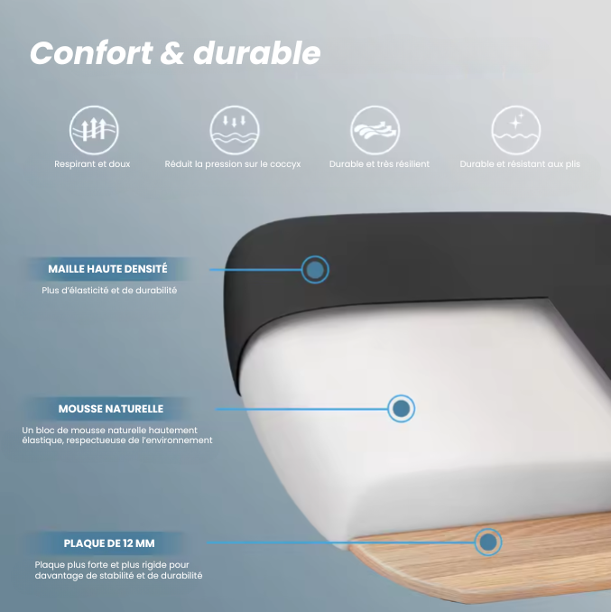 Le coussin d’assise épaissi (7 cm) en mousse haute résilience offre un confort durable et répartit la pression sur les hanches. Le dossier en maille respirante assure une bonne ventilation, même en usage prolongé.